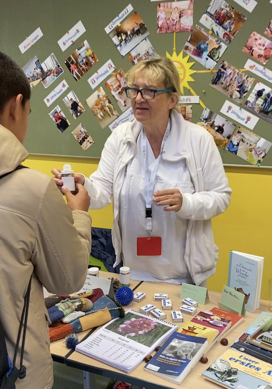 Am Stand der Betreuung wird erklärt, wie man mit Demenzpatienten umgeht.