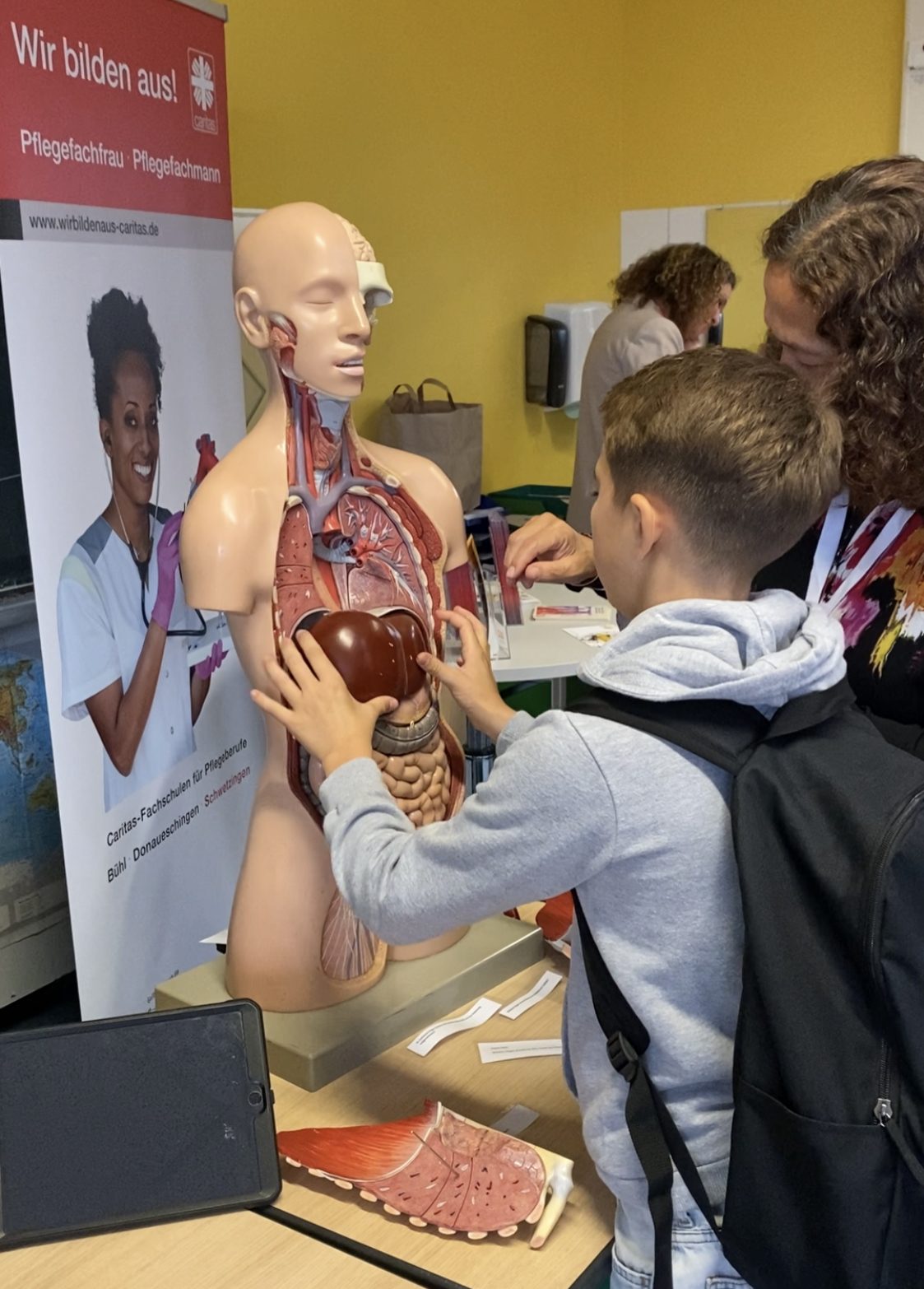 Natürlich durften die Jugendlichen auch typisch pflegerische Tätigkeiten ausprobieren, zum Beispiel unter Anleitung Lagerungstechniken an der Pflegepuppe durchführen, Blutdruck messen und Spritzen am Injektionskissen üben. Am Stand der Caritas-Fachschule für Pflegeberufe durften sie bei Schulleiterin Peggy Naumann außerdem ihr Anatomie-Wissen unter Beweis stellen und bei der Anatomie-Puppe die herausnehmbaren Plastik-Organe an die richtige Stelle setzen.